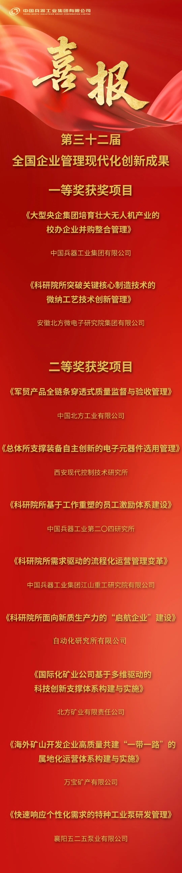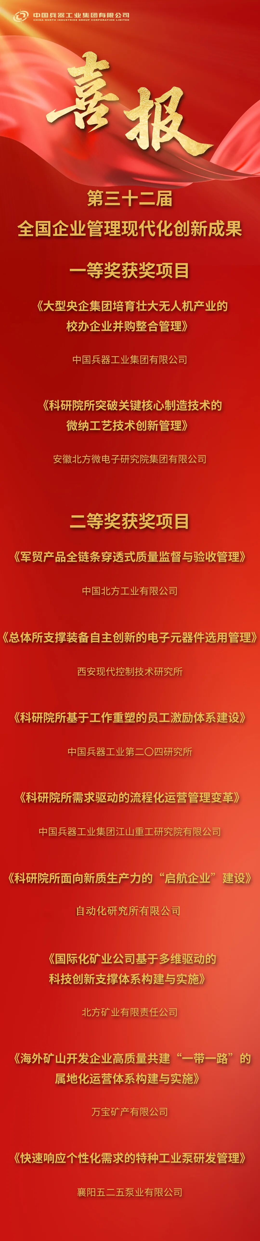 12月25日,全國(guó)企業(yè)管理現(xiàn)代化創(chuàng)新成果審定委員會(huì)發(fā)布第三十二屆全國(guó)企業(yè)管理現(xiàn)代化創(chuàng)新成果名單,兵器工業(yè)集團(tuán)2項(xiàng)成果獲評(píng)一等、8項(xiàng)成果獲評(píng)二等,創(chuàng)歷史最好成績(jī)。