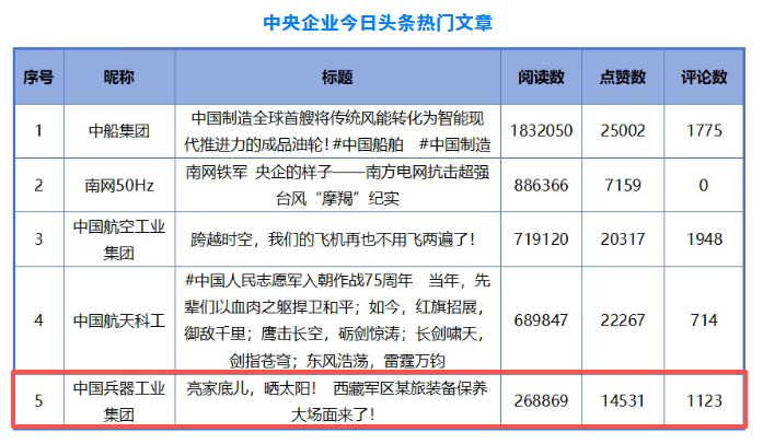 1月3日,國務(wù)院國資委新聞中心聯(lián)合清華大學(xué)新聞與傳播學(xué)院、中國企業(yè)聯(lián)合會,發(fā)布“2025年度中國企業(yè)新媒體指數(shù)”,通過平臺作品數(shù)、播放量、點贊數(shù)、評論數(shù)等維度綜合評估,評選出各中央企業(yè)在微信、微博、視頻號、抖音、快手、今日頭條、知乎、Bilibili等新媒體平臺的5部熱門作品。 兵器工業(yè)集團(tuán)兩部作品入選,其中: 《亮家底兒,曬太陽!西藏軍區(qū)某裝備保養(yǎng)大場面來了!》入選中央企業(yè)今日頭條熱門文章。 《你是什么時候意識到抗日戰(zhàn)爭很艱難的?》入選中央企業(yè)知乎熱門文章。 |